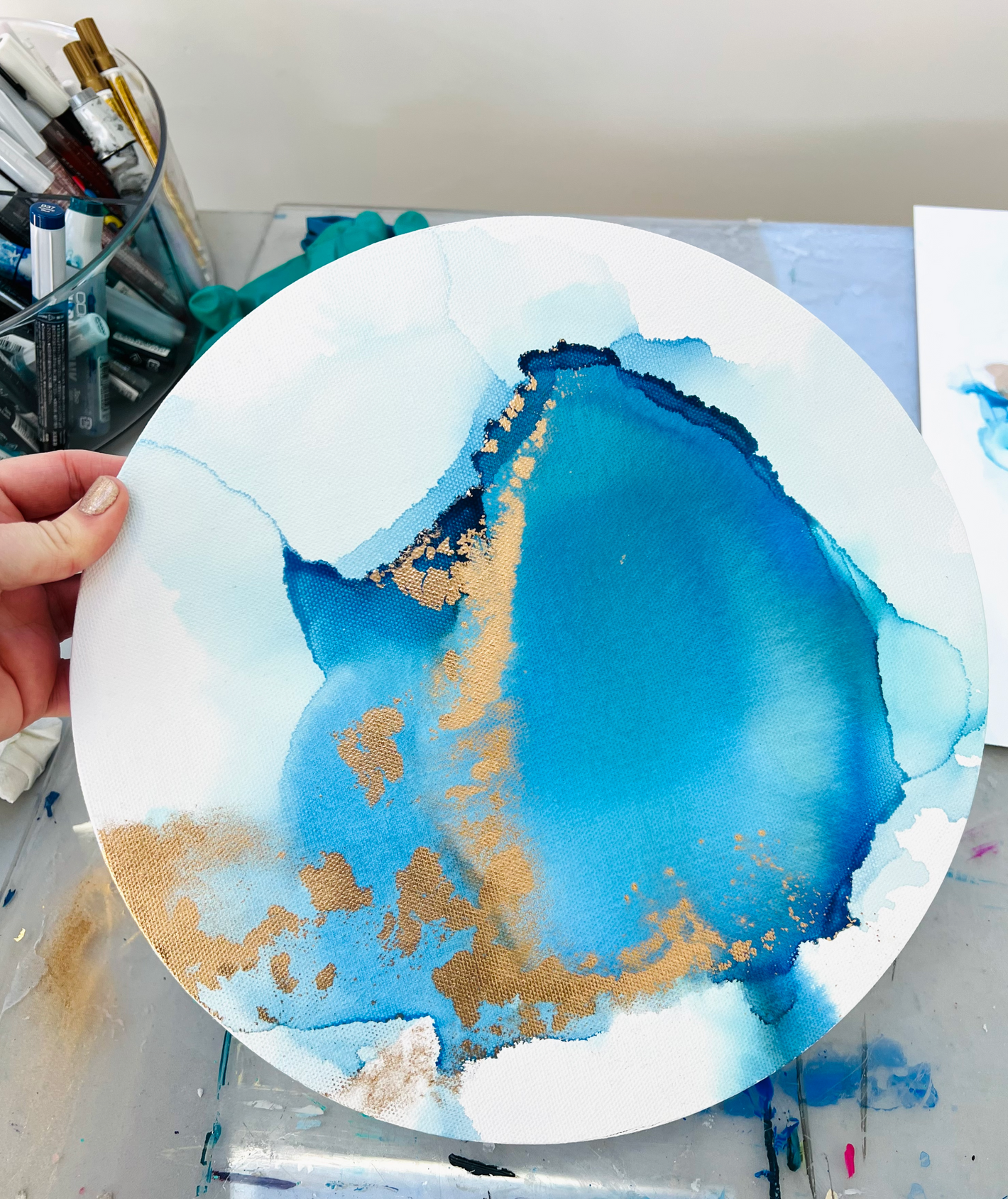"Ali's alcohol ink paintings are beautiful. I was looking for something unique to put in my bedroom in a circle canvas. Ali partnered with me on a custom canvas size and created a vibrant burst of happiness that exceeded my expectations. I love the gold pigment and how it shines at every angle."