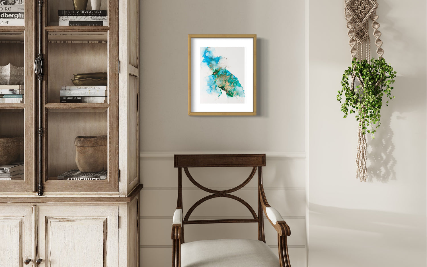 The I am grateful painting I chose pairs perfectly with my golden frame. I love the color gold and how it's weaved into the piece. The blue and turquoise go with my airy coastal vibe. The artwork is tasteful and interesting. A great reminder for me to take a moment and be grateful for a I have.